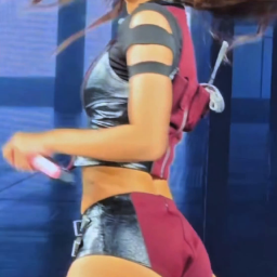 리사는 무대 의상으로 강렬하고 퍼포먼스에 최적화된 스타일을 선보입니다. 블랙과 버건디 컬러 조합의 크롭 상의와 짧은 하의는 리사의 활동적인 이미지를 강조하며, 아이돌 스타일의 매력을 발산합니다. 전체적으로 시크하면서도 강렬한 분위기를 연출하여, 럭셔리한 무대 존재감을 돋보이게 합니다.