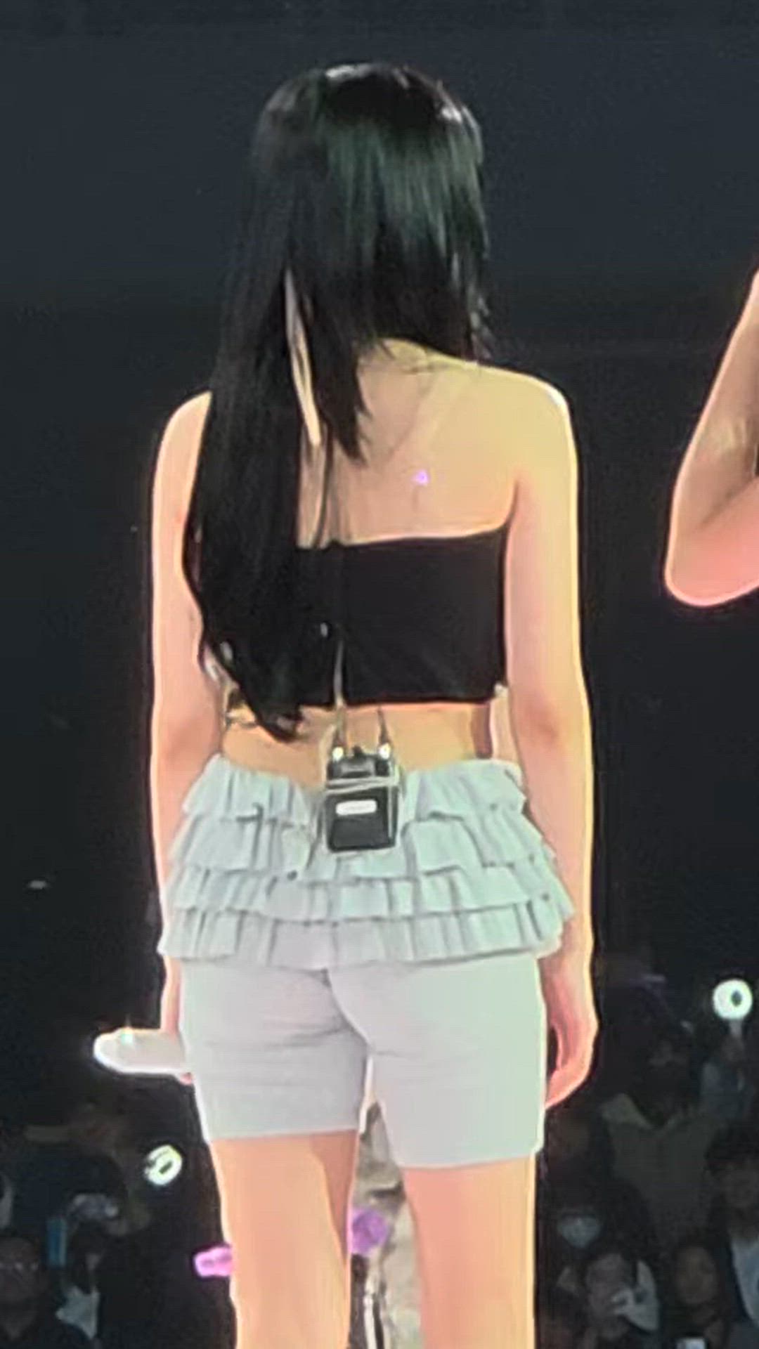 무대 공연을 위한 무선 마이크 송신기가 하의 뒤쪽에 부착되어 있습니다. 또한, 긴 검은색 머리 사이로 밝은 색상의 헤어 익스텐션 또는 하이라이트가 돋보여 스타일에 포인트를 더했습니다.