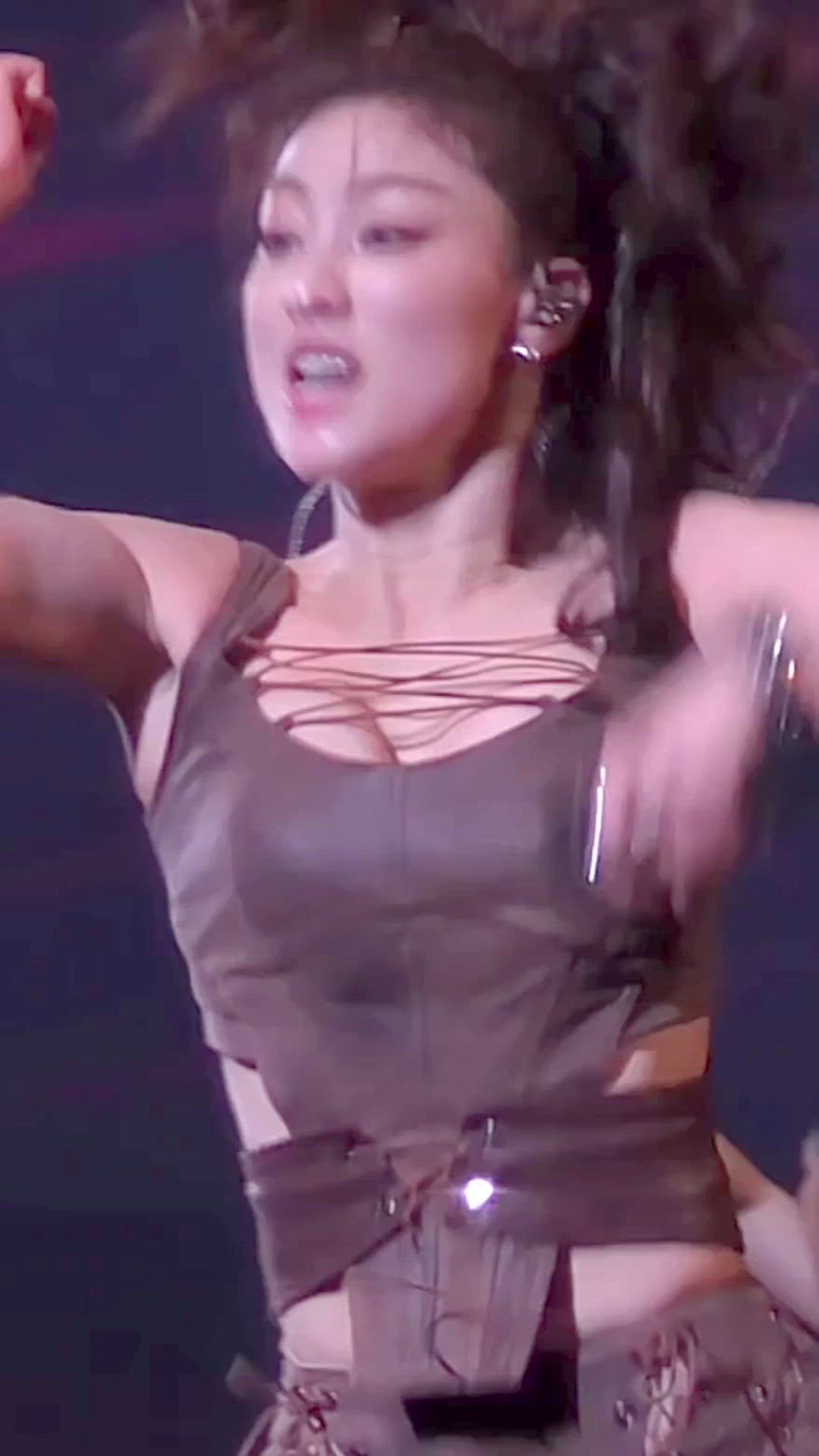 TWICE 지효는 독특한 디자인의 다크 브라운 톤 무대 의상을 착용하여 강렬하고 세련된 스타일을 선보입니다. 상의는 가슴 부분에 여러 개의 스트링 레이스업 디테일이 돋보이는 크롭탑으로, 허리 부분에는 컷아웃과 코르셋 스타일의 디테일이 더해져 있습니다. 전체적으로 빈티지하면서도 현대적인 감각이 느껴지는 이 무대 의상은 지효의 카리스마 넘치는 퍼포먼스를 더욱 돋보이게 합니다.