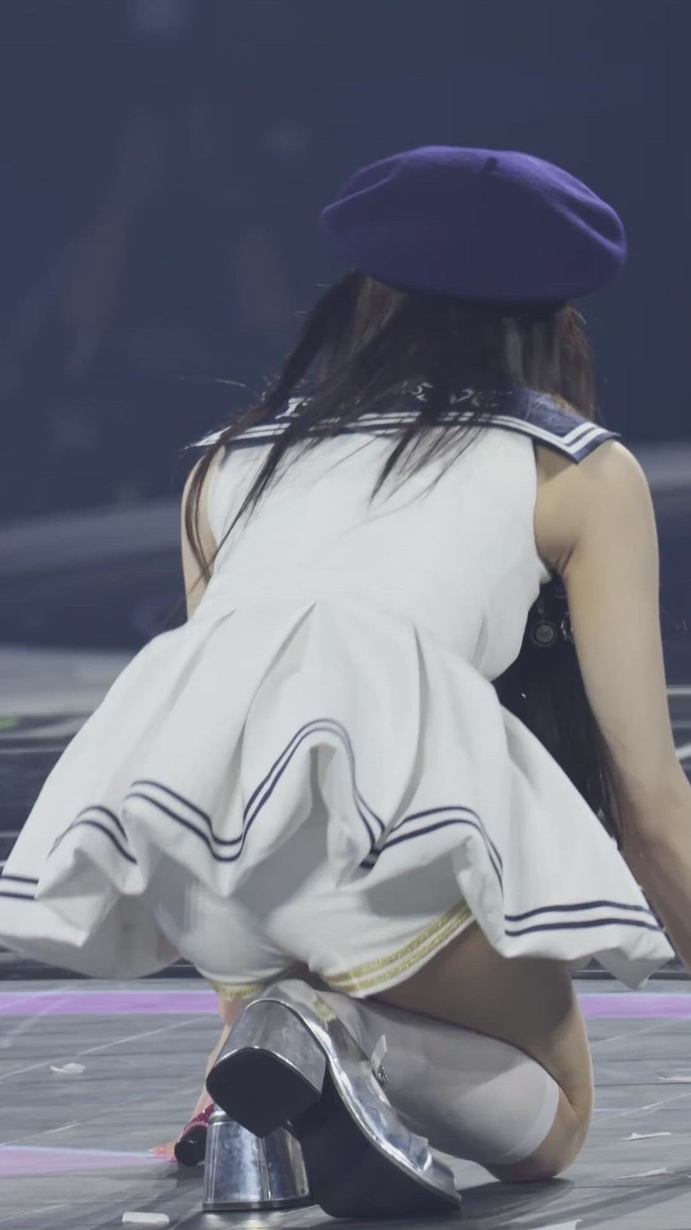 She wears a navy beret, adding a focal point to the overall sailor dress concept. It appears to be made of wool or felt, and its subdued color balances the style. She is wearing silver platform Mary Jane shoes. These shoes feature a chunky heel and a glossy material, creating a glamorous and trendy atmosphere suitable for stage fashion. White knee-high socks are paired with the outfit, further accentuating her leg line and emphasizing the cute charm of the overall marine look.