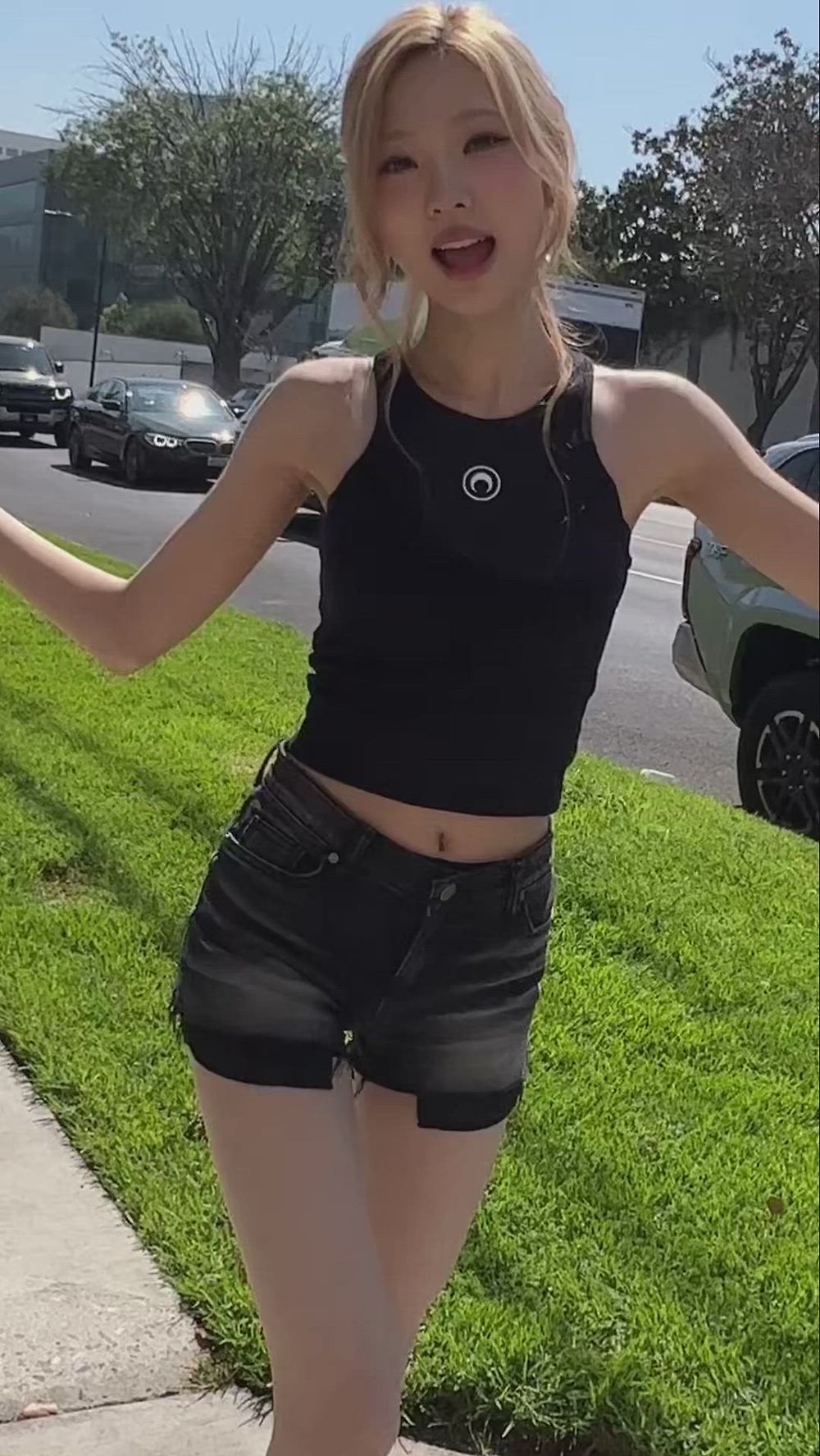 스텔라는 캐주얼 시크한 분위기의 썸머 패션을 선보이고 있습니다. 블랙 크롭 탱크톱과 다크 워시 데님 쇼츠를 매치하여 편안하면서도 스타일리시한 데일리룩을 연출했습니다. 전체적으로 미니멀한 컬러 팔레트와 활동적인 아이템들이 조화를 이루어 젊고 활기찬 아이돌 스타일을 완성하고 있습니다.