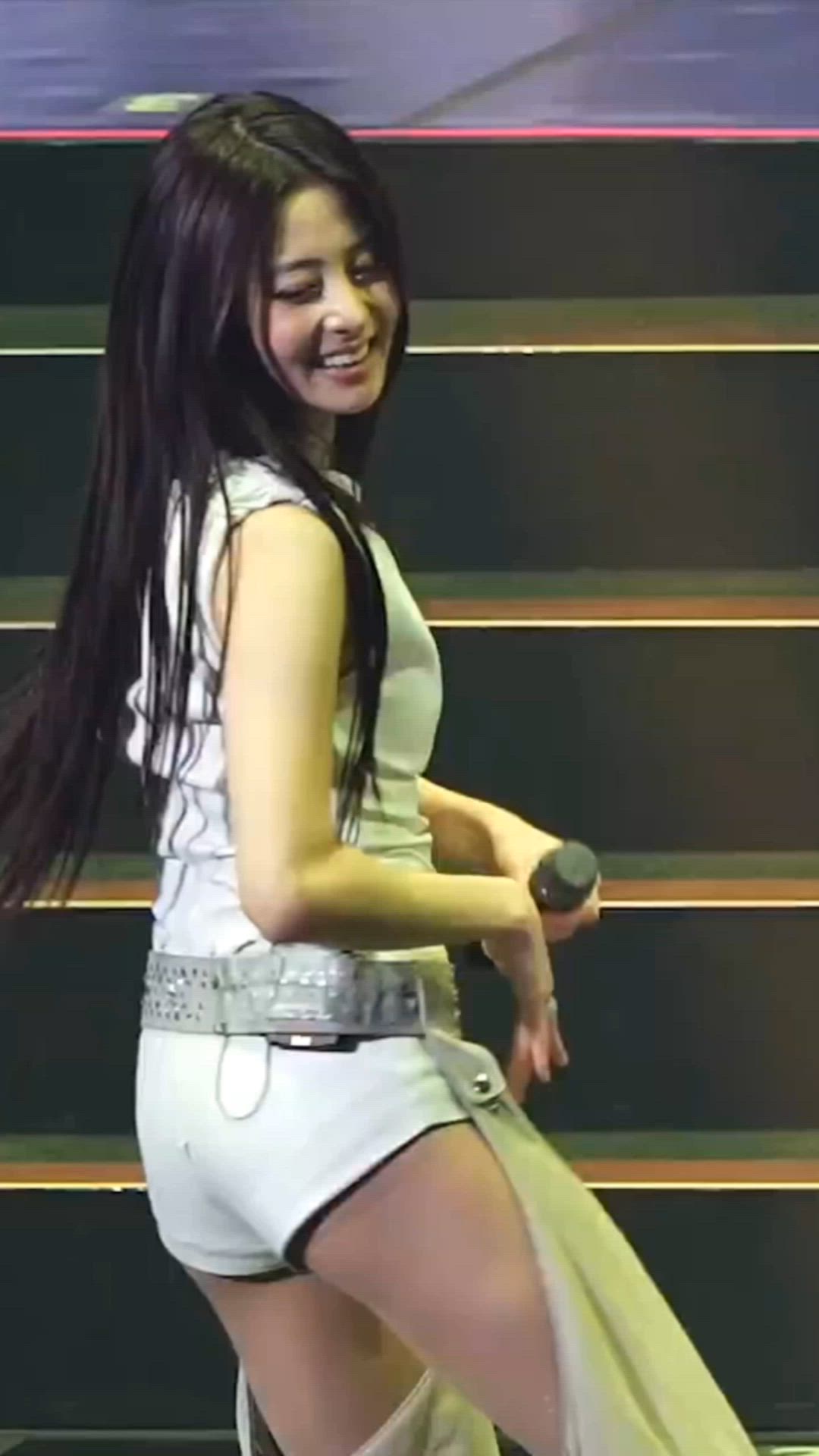 LE SSERAFIM's Yunjin showcases a powerful and sophisticated performance outfit on stage. The overall light-toned ensemble, accented with metallic elements, creates a futuristic and energetic vibe. The sleeveless top and short bottoms are ideal for dynamic stage performances, while the waist belt and draped embellishment complete a bold styling. This look, combined with Yunjin's confident pose, exudes captivating charisma.