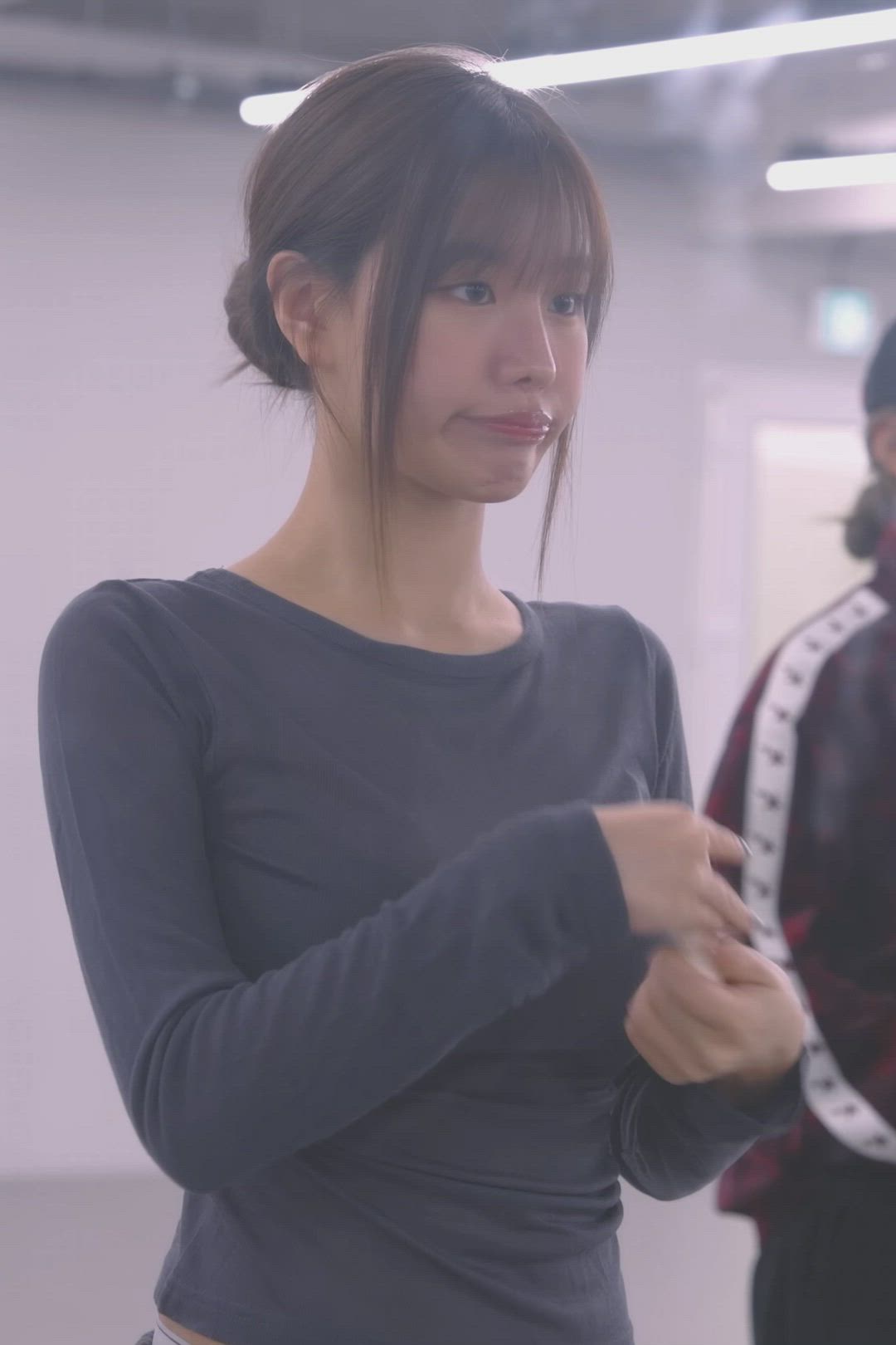 나띠는 다크 그레이 또는 차콜 색상의 긴팔 티셔츠를 착용하고 있습니다. 라운드넥 디자인에 몸에 자연스럽게 밀착되는 슬림핏으로, 부드러운 코튼 또는 신축성 좋은 혼방 소재로 제작된 것으로 보입니다. 특별한 디테일 없이 깔끔하고 미니멀한 실루엣을 강조하며, 일상적인 착용에 적합한 웨어러블한 상의입니다. 이러한 스타일의 티셔츠는 에버레인이나 위크데이에서 찾아볼 수 있습니다.