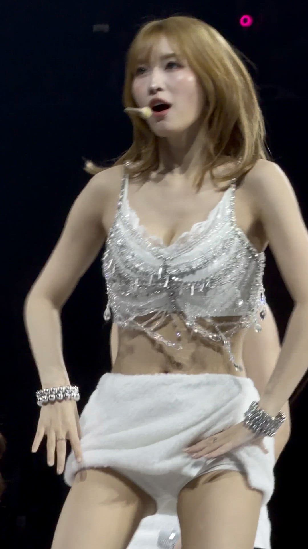 TWICE 모모는 무대 위에서 화려한 무대 의상을 선보이고 있습니다. 밝은 색상의 상의와 하의로 구성된 의상은 전체적으로 반짝이는 디테일과 부드러운 소재를 사용하여 눈길을 끄는 글리터링 패션을 연출합니다. 이러한 퍼포먼스 룩은 모모의 에너지 넘치는 매력을 더욱 돋보이게 하며, 역동적인 무대 위에서 시선을 사로잡는 데 집중한 스타일입니다. 전체적인 룩은 과감하면서도 세련된 느낌을 선사합니다.