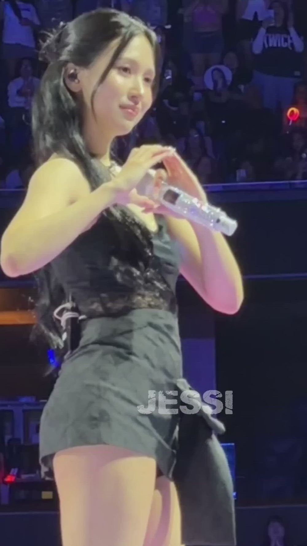 Mina presents a captivatingly chic black mini dress style on stage. The outfit emphasizes a sleek silhouette, with delicate lace details on the upper part, creating an elegant and alluring atmosphere. This type of performance attire perfectly complements Mina's refined stage presence, making it an ideal stage outfit.