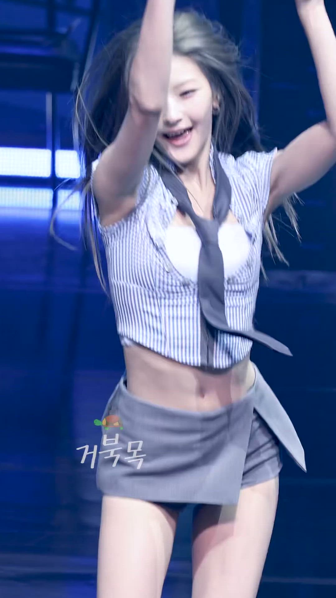 KISS OF LIFE의 하늘은 활동적인 스테이지 의상을 선보입니다. 스트라이프 크롭 셔츠와 그레이 컬러의 언밸런스 스커트 팬츠를 매치하여 발랄하면서도 힙한 패션 스타일을 연출했습니다. 전체적으로 시원하고 경쾌한 느낌을 주며, 하늘의 건강미를 강조하는 아이돌 코디입니다.