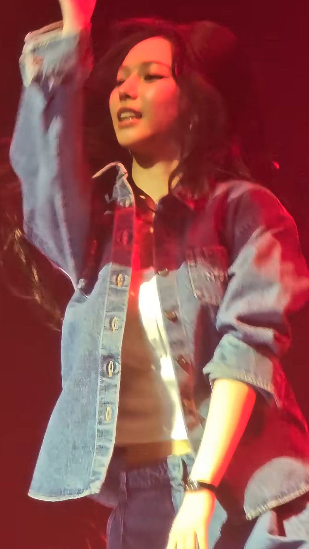 Karina presents a chic casual styling by pairing a denim jacket with dark denim pants. This street fashion look, which appears to be an active stage outfit, creates a comfortable yet stylish ambiance.