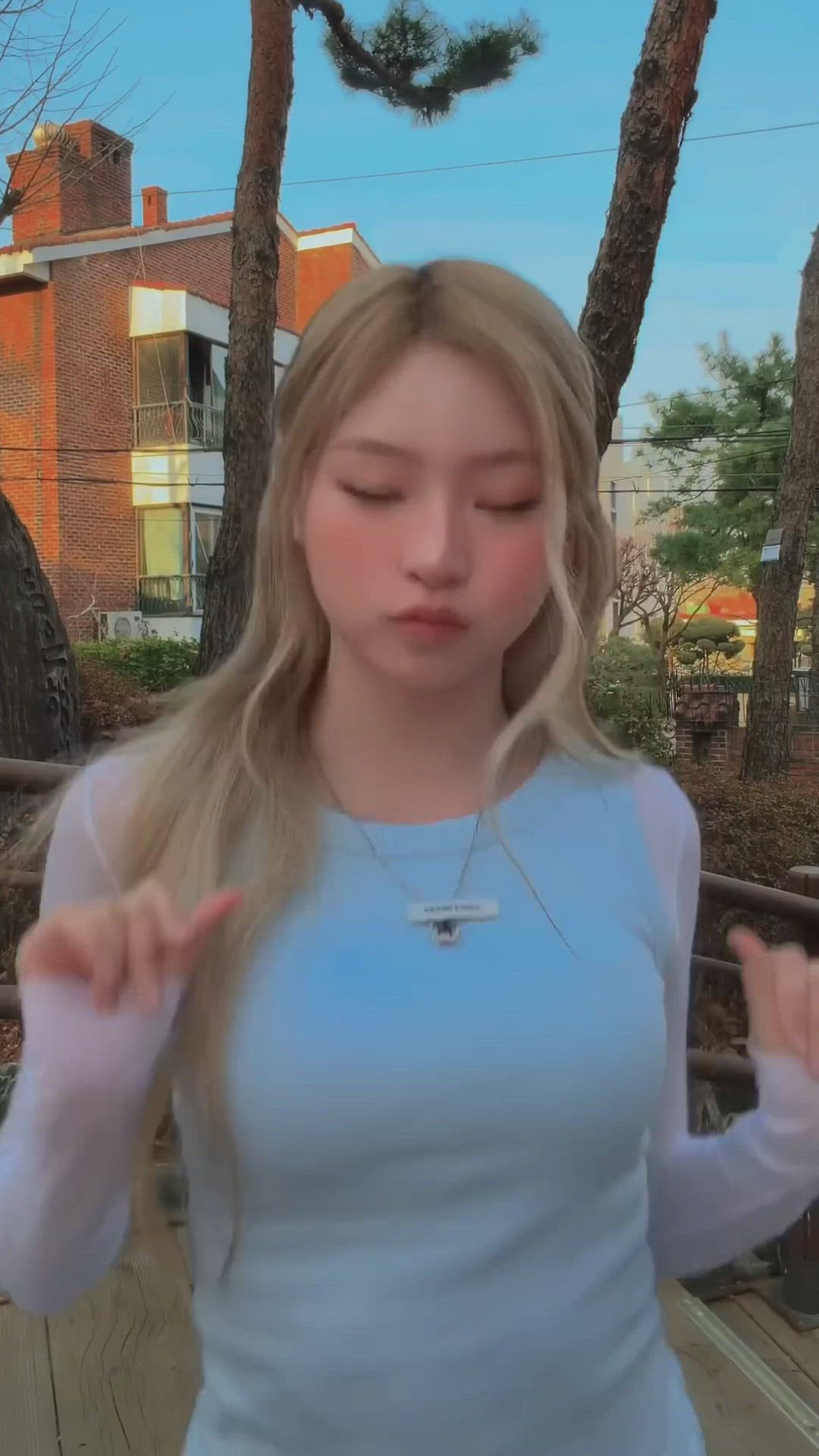 KiiiKiii의 하음은 레이어드 스타일의 상의로 트렌디하고 편안한 아이돌 패션을 선보입니다. 연한 하늘색 민소매 상의와 흰색 시스루 긴팔 티셔츠를 겹쳐 입어 캐주얼 시크하면서도 사랑스러운 분위기를 연출합니다. 밝은 금발 헤어스타일과 자연스러운 메이크업이 전체적인 룩과 조화를 이룹니다.
