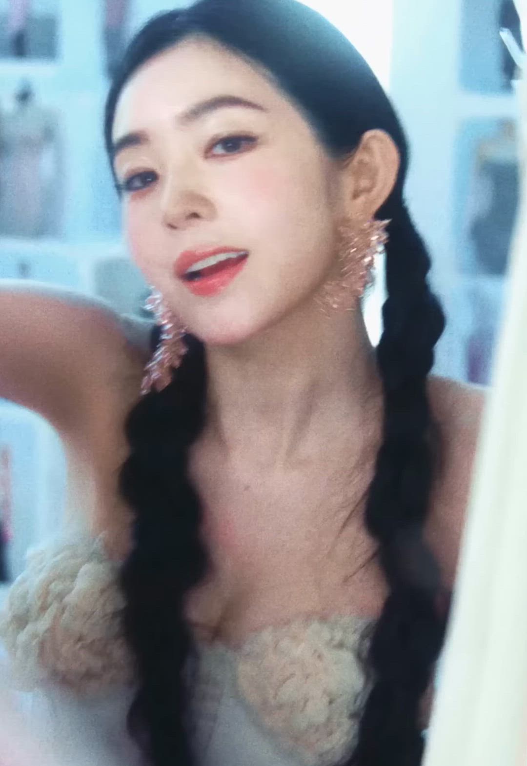 In this image, Irene showcases a luxury and elegant style. Her top is a strapless dress or bustier, featuring delicate textures and voluminous ruffles that evoke the intricate craftsmanship of haute couture. She pairs this with elaborate and uniquely designed earrings, adding a striking focal point to the overall ensemble. Her neatly braided pigtails enhance a dreamy yet sophisticated charm.