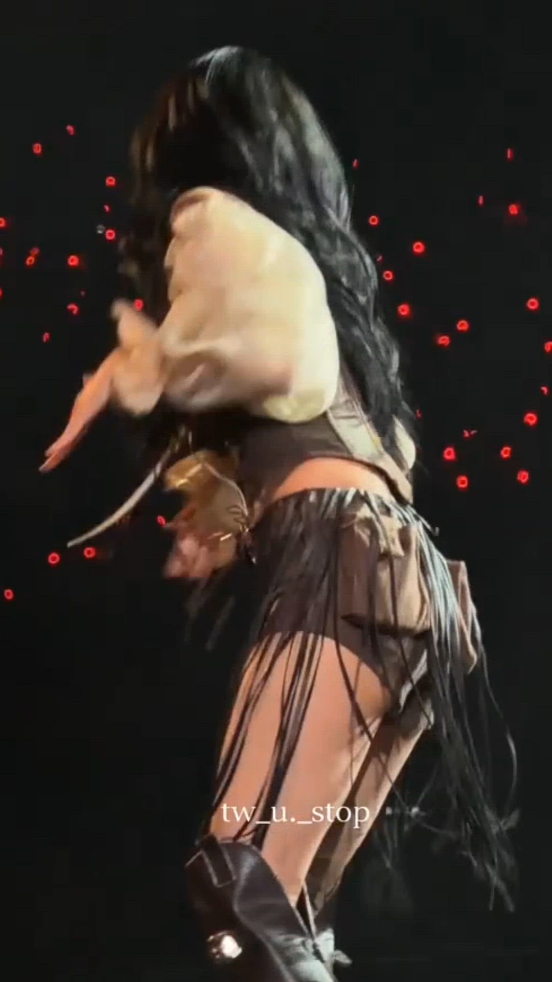 To complete the look, Chaeyoung pairs the outfit with black Western-style cowboy boots. The boots feature silver-toned metallic embellishments around the ankle, adding a distinctive detail. She also wears a gold-toned chain or decorative belt around her waist, enhancing the glamorous appeal. The boots are similar to Western boots from Saint Laurent or Chloé, and the belt appears to be inspired by designs from Gucci or Versace.