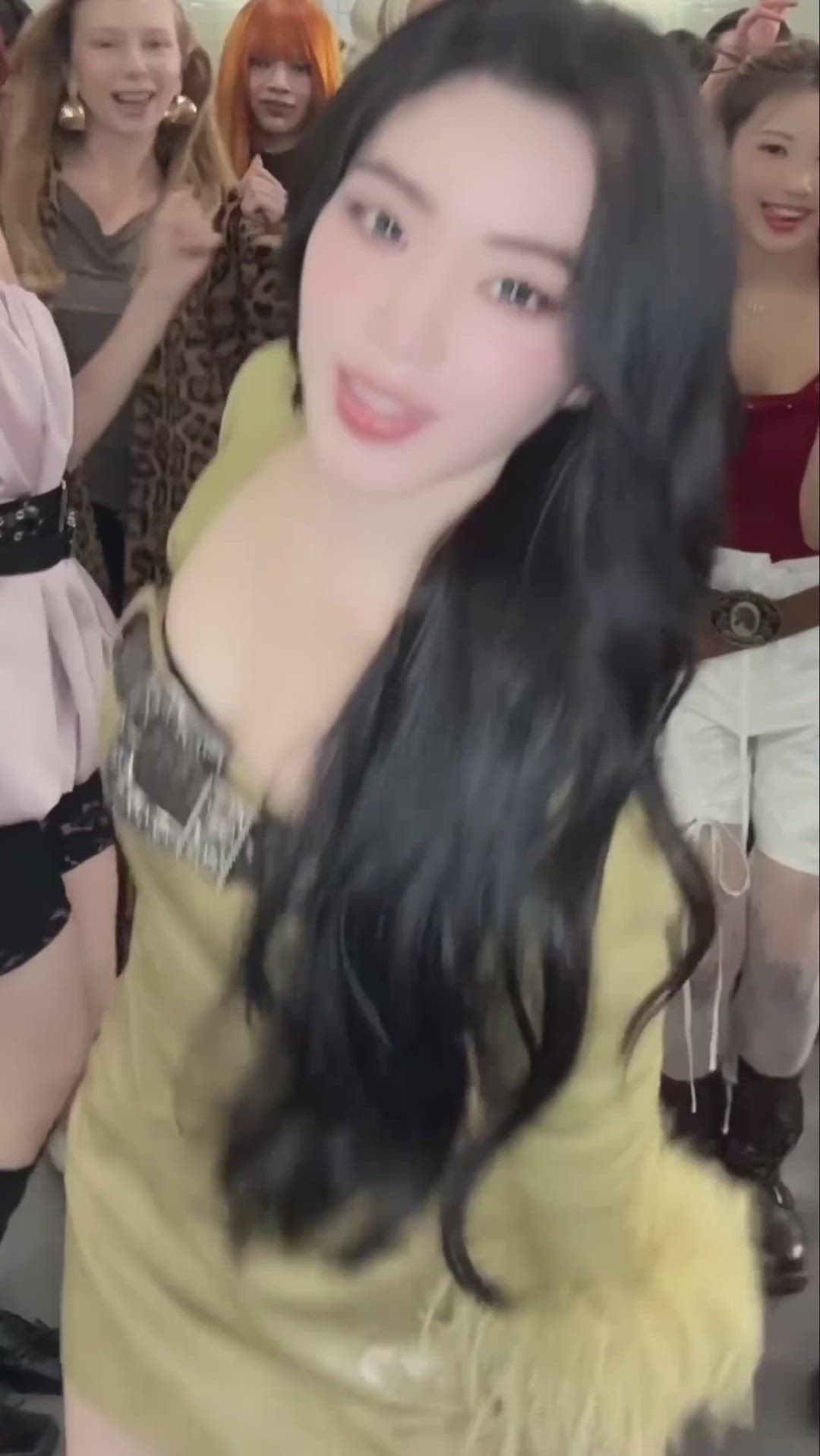 In the picture, Irene is wearing a mini dress that exudes a glamorous and sophisticated charm. The bright olive green dress features a deep V-neckline with dazzling embellishments, drawing attention, while feather or fringe details on the skirt's hem create a lively and opulent atmosphere. This outfit showcases a chic style suitable for a special party look or event.