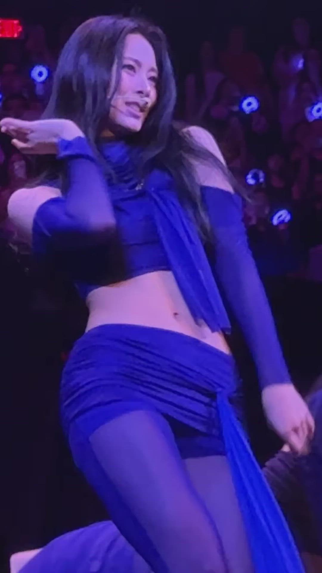 Tzuyu from TWICE presents a captivating performance look on stage, adorned in a vibrant royal blue ensemble. The outfit, featuring a cropped top, a mini skirt, and sheer stockings, harmonizes to emphasize her slender silhouette. Notably, the elegant draped fabric details on both the top and bottom sway gracefully with Tzuyu's movements, adding a dramatic allure to her stage presence. The cohesive color scheme and bold design create a visually striking style.