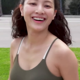 Jihyo showcases an active and healthy sports style. She is wearing an olive green sports bra, creating a comfortable yet stylish activewear look. Her natural hairstyle and bright smile add to her refreshing charm.