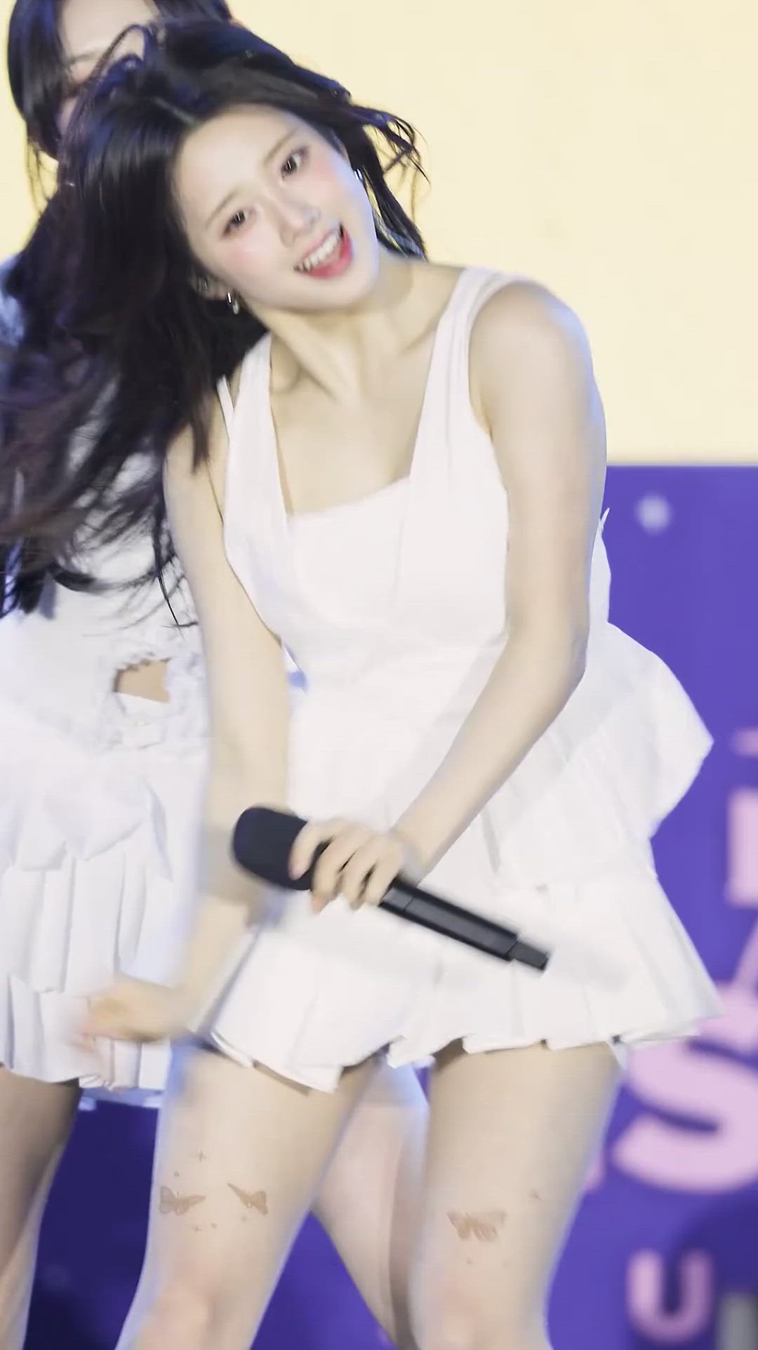 Nayoung presents a pure and vibrant charm on stage with a white mini dress style. The overall bright white color enhances her energetic aura, while the simple yet elegant square neckline top and the lively silhouette of the skirt create a harmonious look. This outfit is suitable for active performances and exudes a lovely feminine aesthetic. The clean and refreshing vibe of the attire is particularly well-suited for the summer season.