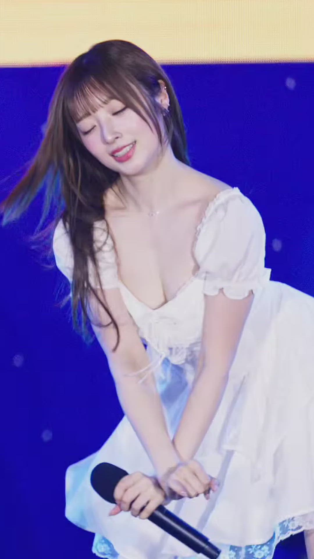 LIGHTSUM 히나는 순백의 드레스를 착용하여 로맨틱하고 청순한 매력을 발산하고 있습니다. 오프숄더 디자인과 퍼프 소매가 돋보이는 이 의상은 페미닌한 분위기를 강조하며, 무대 위에서 히나의 화사함을 더욱 돋보이게 합니다. 전체적으로 소녀스러운 감각이 묻어나는 미니 드레스 스타일입니다.