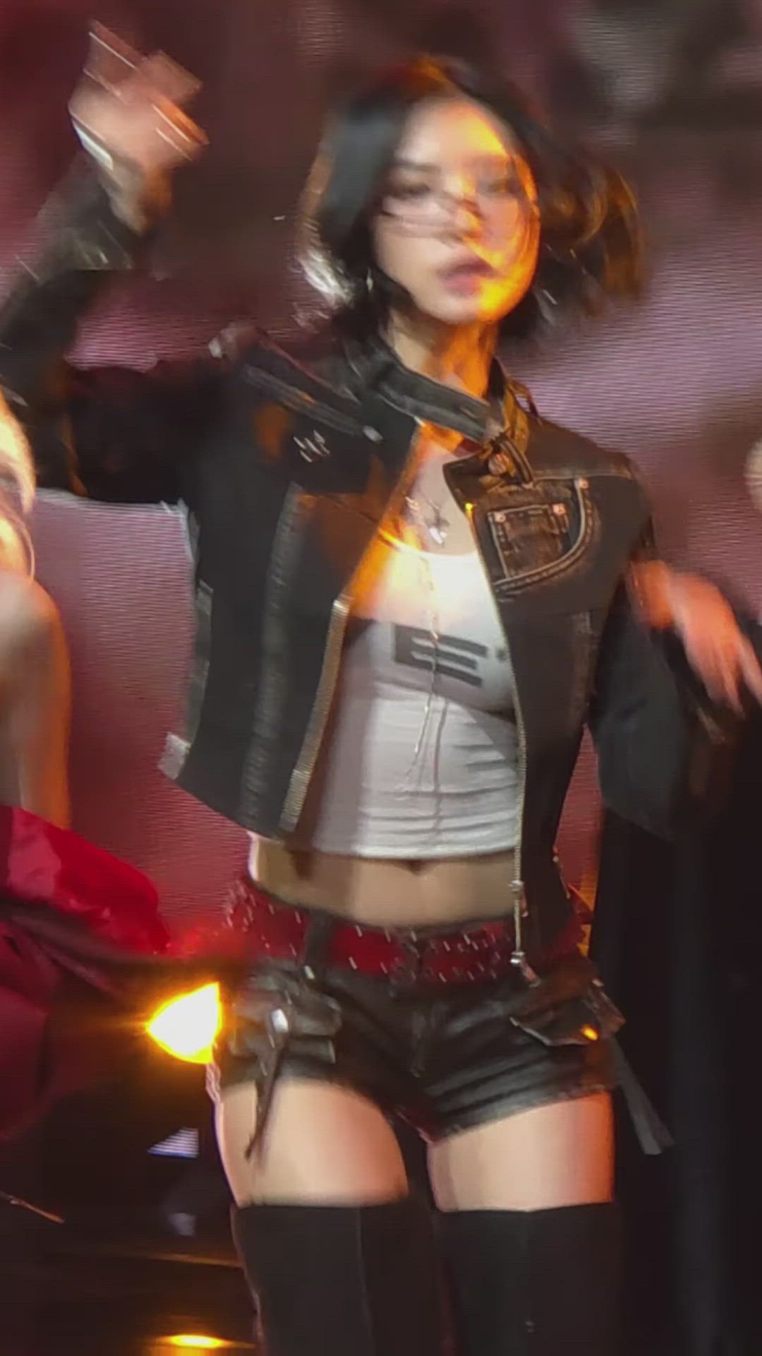In this image, Dayeon showcases a powerful stage outfit, exuding an edgy rock-chic aesthetic. Her look predominantly features black items, accented by a white crop top and a red belt, creating a charismatic style. The cropped length of her top and jacket, combined with short bottoms, highlights Dayeon's dynamic image and conveys energetic vitality. This style prominently features bold and trendy leather apparel.