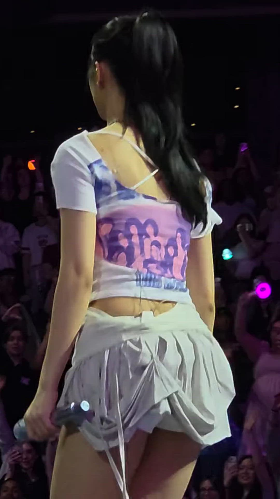 쯔위는 무대 위에서 크롭 상의와 풍성한 볼륨감의 하의를 매치하여 활동적이면서도 발랄한 아이돌 무대 의상을 선보입니다. 상의는 캐주얼한 크롭 티셔츠로, 등 부분의 유니크한 그래픽 프린트와 엑스자 스트랩 디테일이 돋보입니다. 하의는 연한 색상의 러플 쇼츠로, 편안하면서도 사랑스러운 분위기를 연출합니다. 전체적으로 쯔위의 상큼하고 역동적인 매력을 강조하는 퍼포먼스 패션입니다.