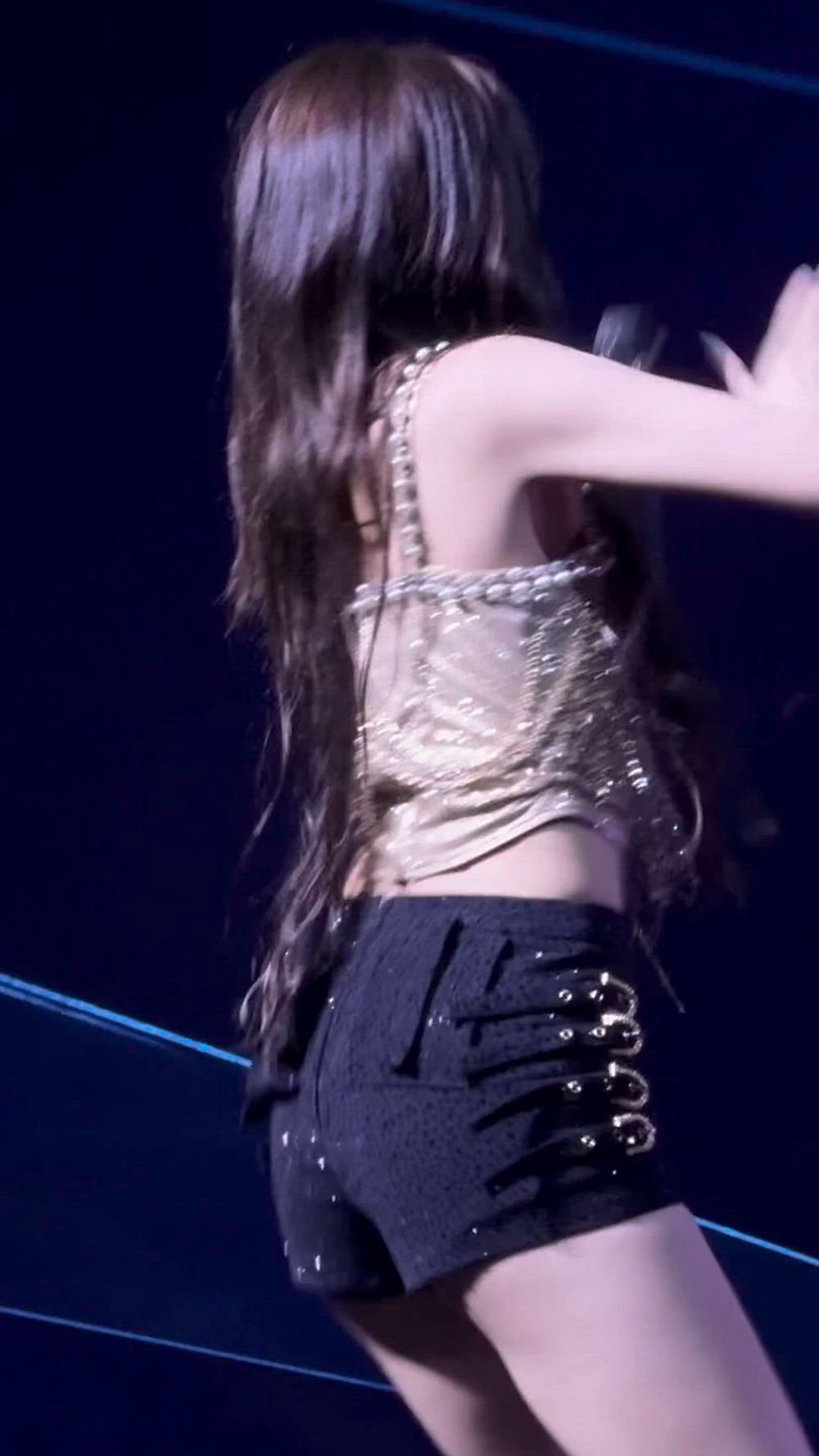 No distinct accessories are visibly worn in the photo, but the elaborate details of the outfit itself effectively serve as accessories. The sparkling top and the buckle embellishments on the shorts harmonize to complete the overall style, perfectly suited for a stage environment.