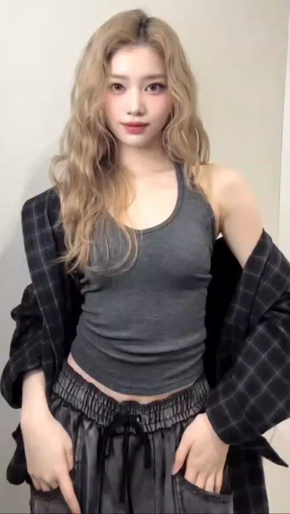 샤오팅은 스트리트웨어 감성이 돋보이는 편안하면서도 스타일리시한 룩을 선보이고 있습니다. 회색 골지 탱크톱에 블랙 체크 패턴의 재킷을 어깨에 걸치고, 광택 있는 블랙 조거 팬츠를 매치하여 활동적인 매력을 강조합니다. 전체적으로 톤온톤의 어두운 컬러 팔레트를 사용하여 시크하고 세련된 분위기를 연출합니다.