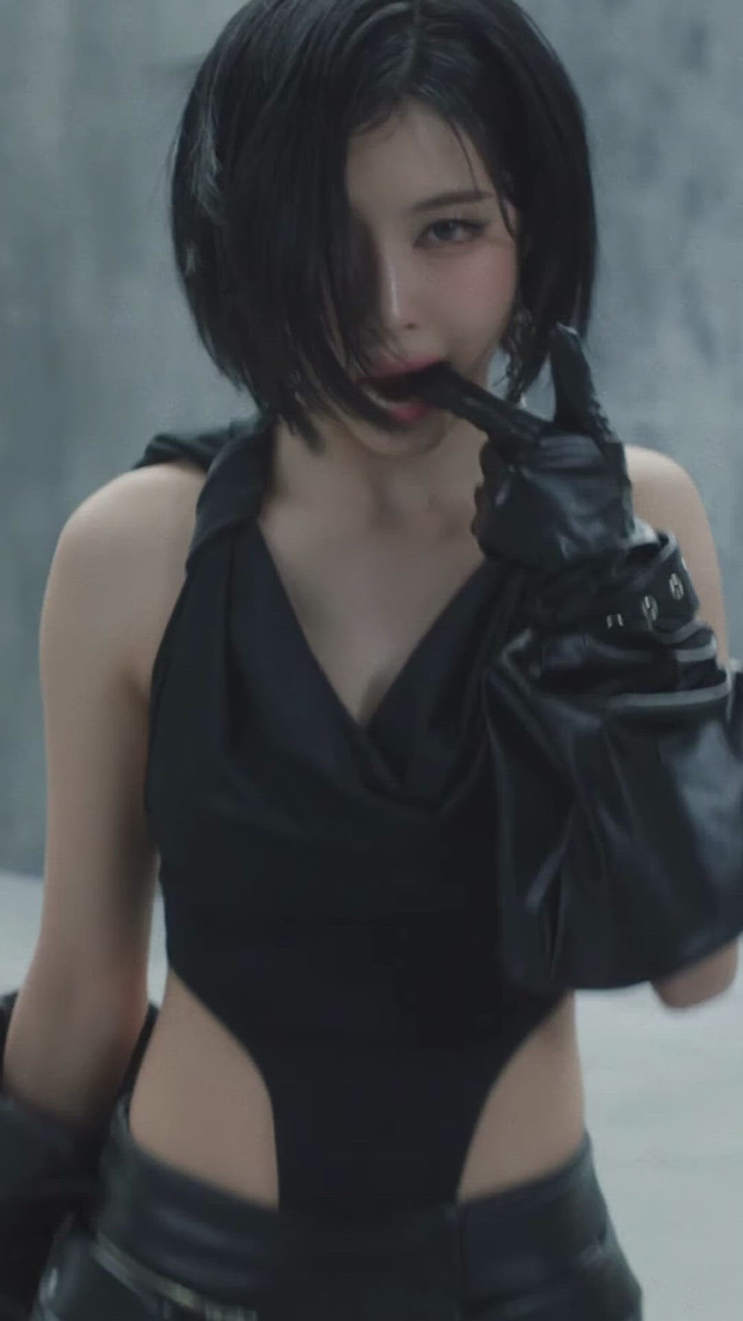 Dayeon presents a powerful and urban appeal with an all-black, chic style ensemble. The top features a deep V-neck and draped details, connecting to waist cutouts, creating a bold yet sophisticated performance wear aesthetic. Long leather apparel gloves add an edgy touch to the overall look, emphasizing her charismatic presence.