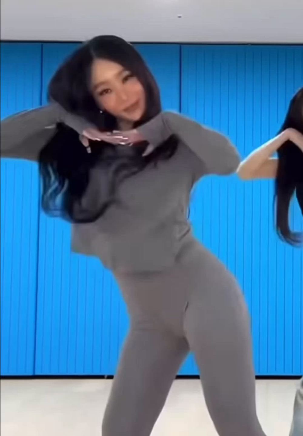 Hyolyn presents a comfortable yet stylish athleisure look. She pairs a grey cropped long-sleeve top with matching leggings, creating an active vibe. The overall silhouette emphasizes her body line, highlighting a healthy aesthetic, and showcases a dancewear style suitable for practice.