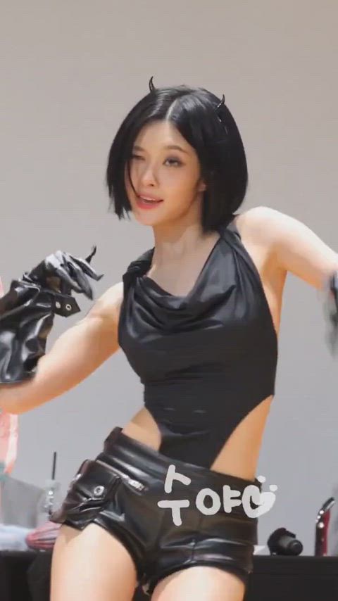 In this image, Dayeon presents an intense and captivating glamorous look. She pairs black top, bottom, and accessories to create a cohesive style. The bold cut of the halter-neck top and short leather shorts highlight Dayeon's healthy and energetic image, while devil horn hair accessories and gloves add a funky yet chic appeal. Overall, the outfit evokes a festival-ready vibe, suitable for stage performances or special events.
