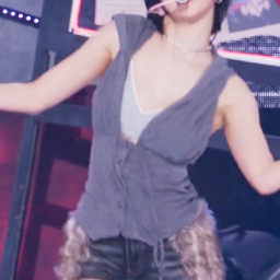 In the photo, Dayeon presents a powerful and hip stage outfit. She has created a distinctive style with dark, trendy colors, distressed details, and fur elements. She layered a white inner top with a gray sleeveless outer top, and paired black shorts with voluminous fur leg warmers, creating an eye-catching and unique fashion. This style further emphasizes the energy of her performance.