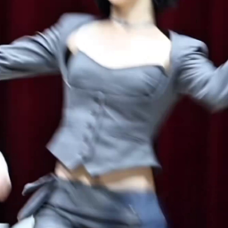다크 그레이 컬러의 크롭 재킷과 코르셋 스타일의 톱을 착용했습니다. 재킷은 어깨 라인이 강조된 짧은 기장으로, 코르셋 톱 위에 걸쳐 입어 시크하면서도 과감한 분위기를 연출합니다. 코르셋 톱은 바스트 라인을 강조하며 중앙에 단추 디테일이 있어 클래식한 코르셋의 특징을 보여줍니다. 소재는 매트한 질감의 가죽 또는 인조 가죽으로 보이며, 지방시나 발렌시아가와 같은 브랜드에서 볼 수 있는 구조적인 디자인과 유사한 느낌을 줍니다.