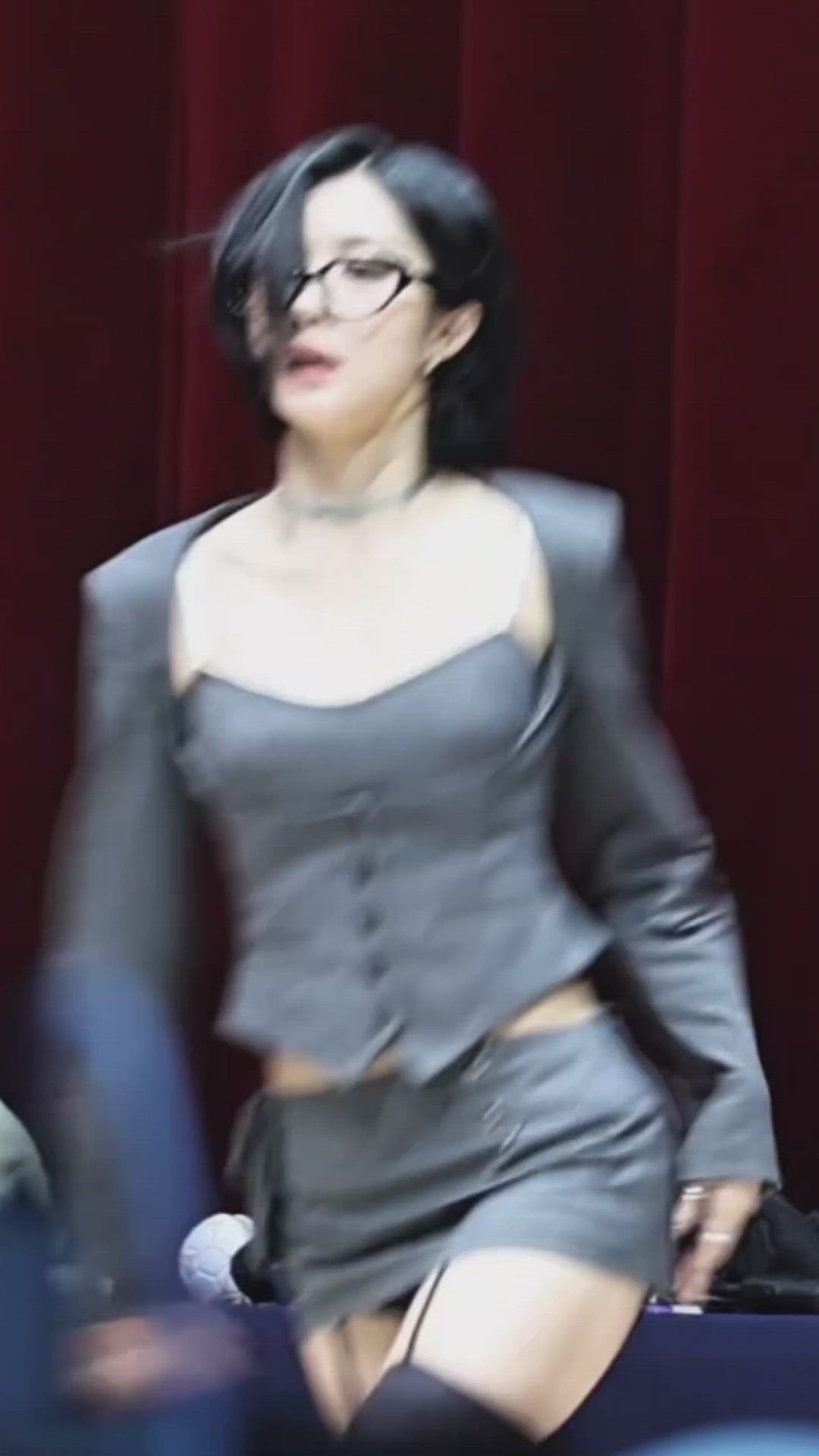She wears a mini skirt in the same dark grey color as the top. The mini skirt has a fitted silhouette, accentuating Dayeon's slender legs, and the matching material unifies the overall look. There appear to be small details around the waist of the mini skirt, which aligns with the bold designs from brands such as Diesel or AllSaints.