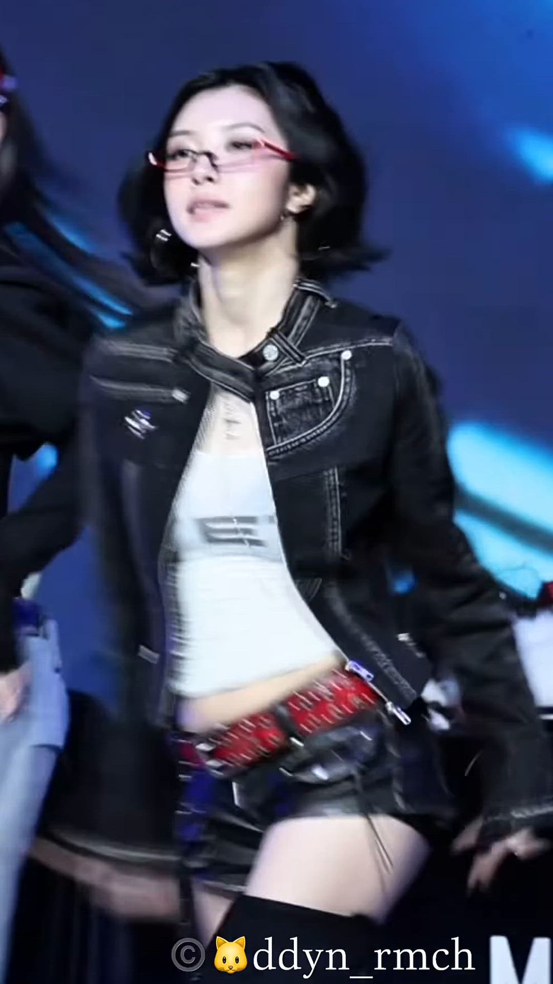 Dayeon completes a powerful and chic look by utilizing a black leather jacket and shorts. This sophisticated high-end leather jacket perfectly matches Dayeon's energetic performance and creates a trendy mood.