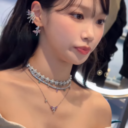 김채원은 화려한 주얼리를 활용하여 우아하고 고급스러운 분위기를 연출합니다. 특히 고가 라인의 크리스털 초커와 귀걸이를 매치해 럭셔리한 스타일링을 완성하며, 섬세한 디테일이 돋보이는 액세서리로 세련된 하이엔드 룩을 보여줍니다.