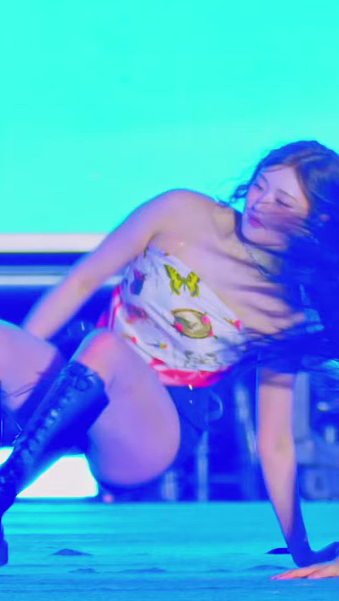 Athena wears a tube top featuring vibrant graphics, completing a trendy and sophisticated high-end look. The bold exposure and sleek silhouette harmonize to leave a powerful impression on the stage.