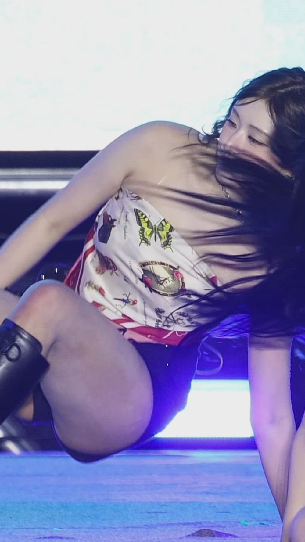 Athena는 화려한 그래픽이 돋보이는 스카프 형태의 튜브톱을 착용하여 트렌디하고 감각적인 룩을 완성합니다. 이번 스타일은 프리미엄 의류와 조화를 이루며 무대 위에서 강렬한 시각적 효과를 주는 럭셔리 스타일링의 정석입니다.