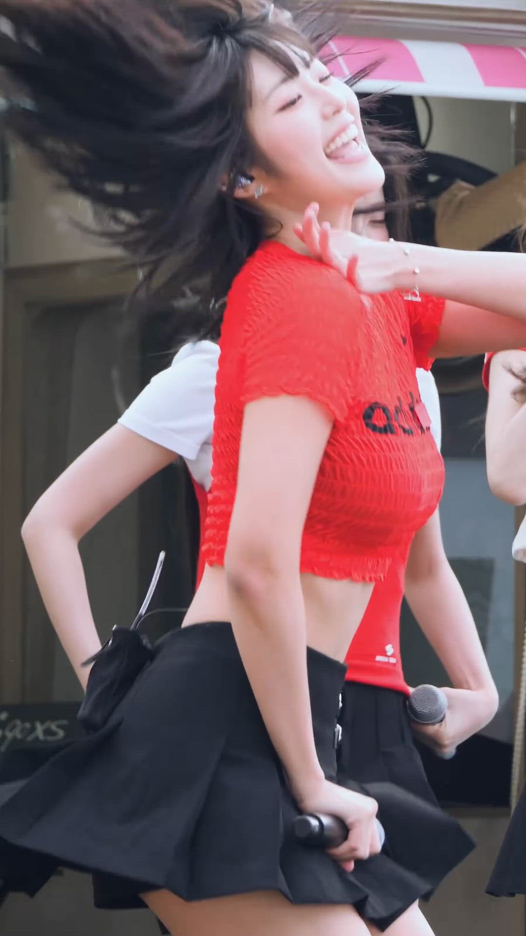 Yel은 강렬한 레드 컬러의 크롭탑과 블랙 플리츠 스커트를 매치하여 에너제틱하고 트렌디한 무드를 완성했습니다. 이러한 하이엔드 스트리트 스타일은 활동성을 강조하면서도 세련된 실루엣을 보여주며, 고가의 프리미엄 아이템을 활용해 룩의 완성도를 높였습니다.