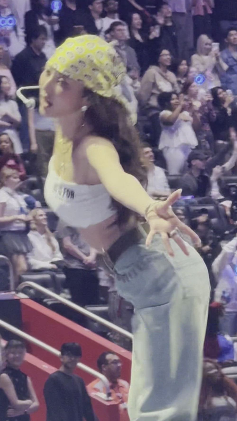 Jihyo perfectly embodies a sporty yet hip street fashion style under the intense stage lights. By pairing a white crop top with wide-leg denim pants, Jihyo maximizes mobility while completing a stylish high-value look with luxurious accessories and a hair bandana.