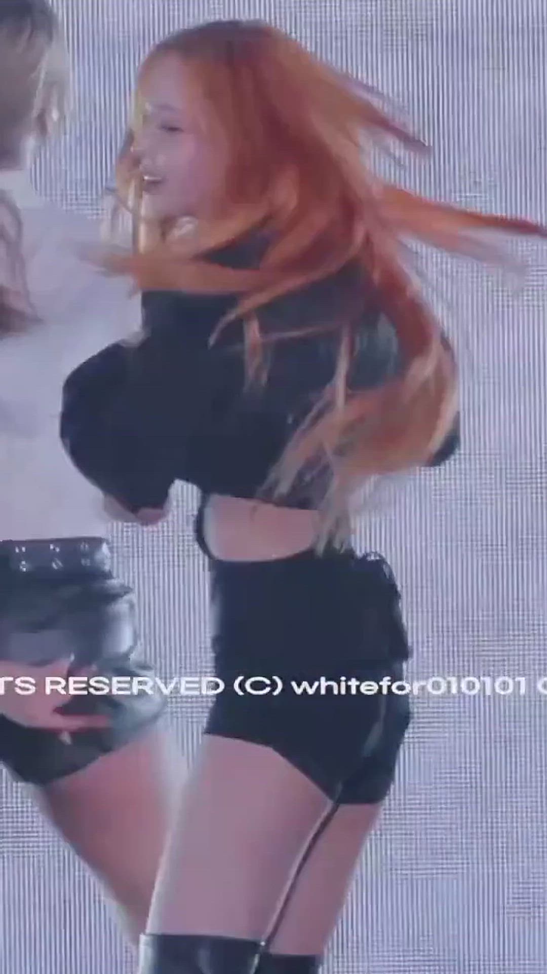 Winter wears a sophisticated all-black ensemble that captures attention under the stage lights. The combination of a cropped top that daringly highlights the waistline and high-waisted bottoms accentuates Winter's silhouette, completing the look as a luxury stage outfit.