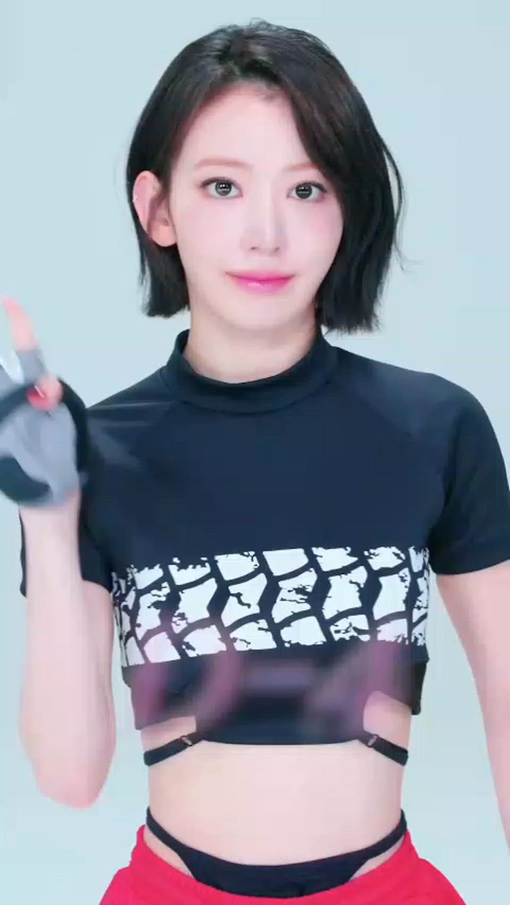 Sakura showcases an intense and sporty athleisure look. By pairing a crop top with a striking tire pattern and vibrant red bottoms, Sakura completes an active yet stylish luxury athletic mood.