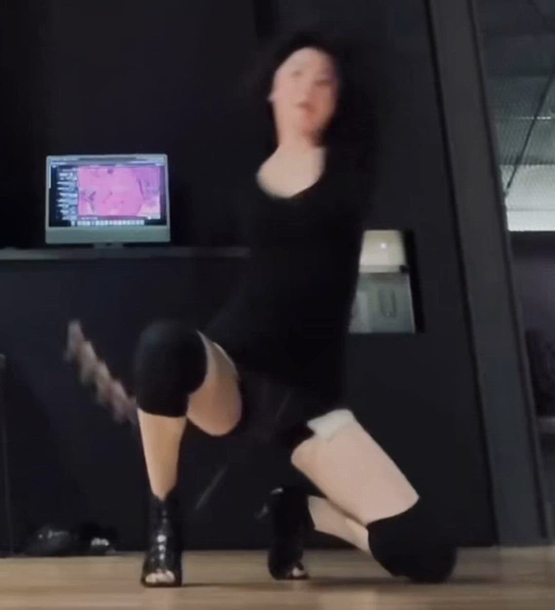 Asa showcases an all-black athleisure look that highlights a powerful performance. The combination of a form-fitting top and bottoms focused on mobility emphasizes Asa's dynamic dance skills, presenting a minimalist yet sophisticated premium luxury aesthetic.