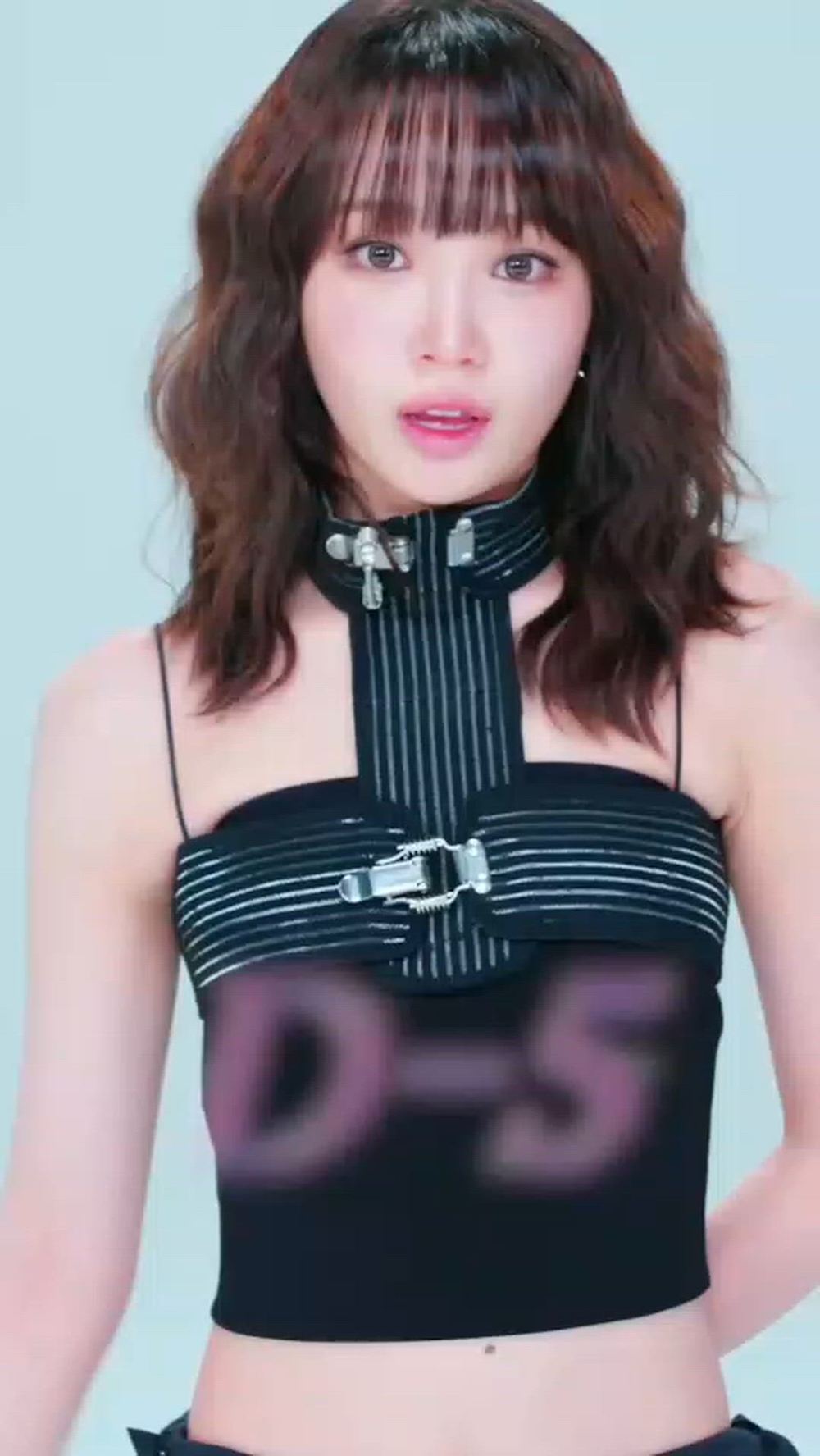 Chaewon showcases a chic and futuristic vibe with a black tube top featuring bold strap details and metallic buckle accents. This high-end look emphasizes a sophisticated sense of style, completing an unparalleled luxury fashion aesthetic.
