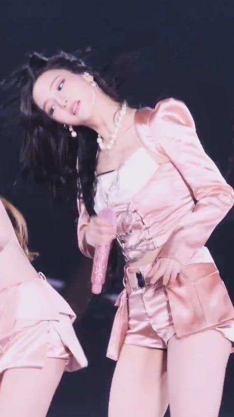 카리나는 무대 위에서 광택감이 돋보이는 핑크 새틴 소재의 셋업을 착용하여 화려하고 세련된 럭셔리룩을 완성합니다. 정교한 디테일이 가미된 상의와 짧은 하의의 조합은 카리나의 실루엣을 강조하며, 진주 액세서리를 더해 우아한 분위기를 극대화합니다.