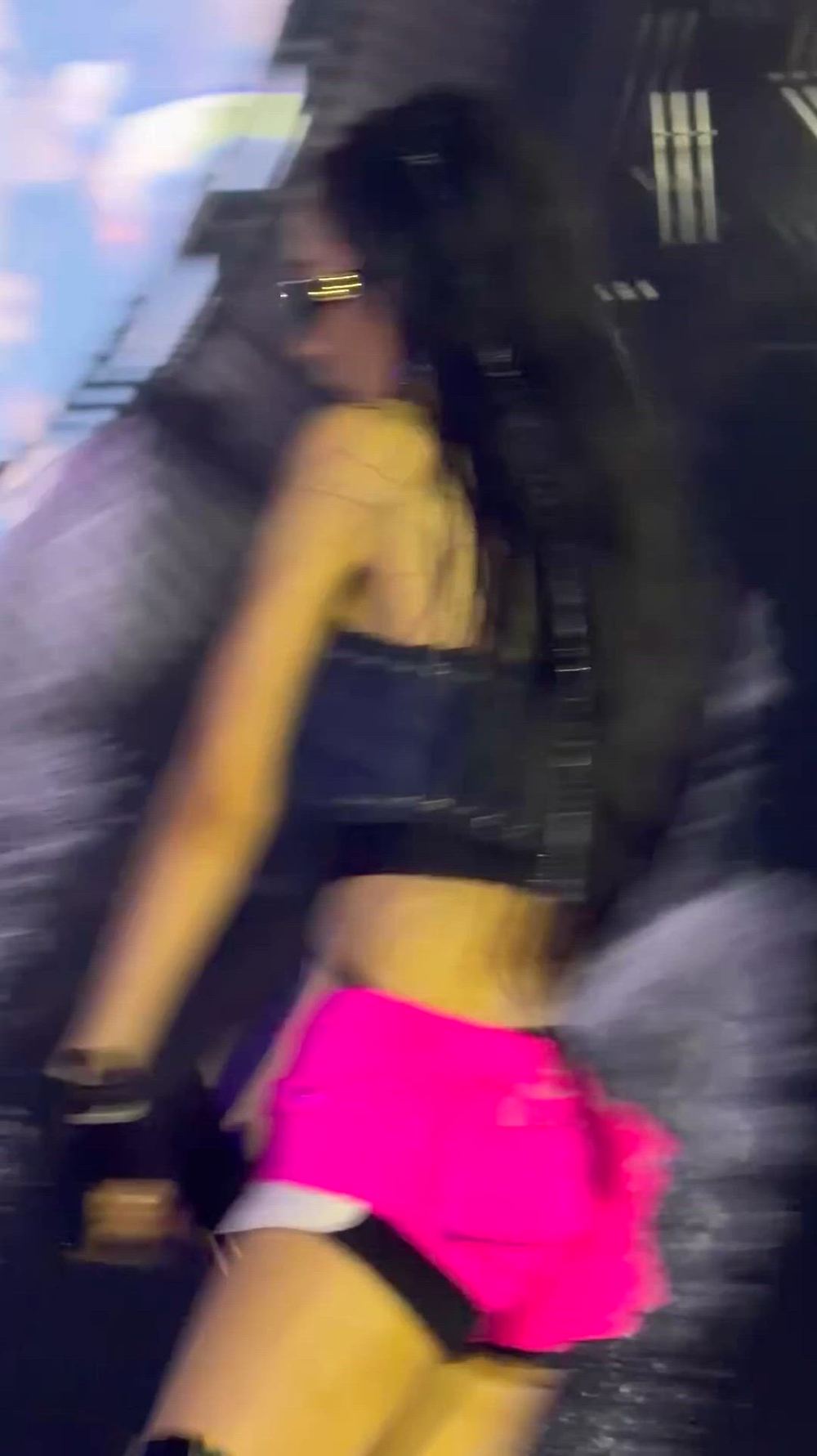 Julie completes an energetic and sporty mood by utilizing a vibrant hot pink color as a focal point. By pairing a denim crop top with active shorts, Julie presents a trendy high-end street look that simultaneously embodies a luxurious sensibility and practical style.