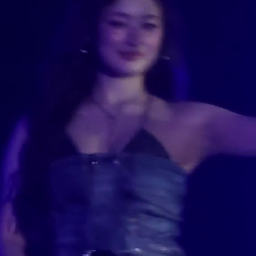 Athena는 블랙 홀터넥 상의와 데님 소재의 튜브톱을 레이어드하여 감각적인 룩을 완성합니다. 이러한 스타일링은 고급스러운 분위기를 자아내는 하이엔드 감성을 강조하며, 무대 위에서 시선을 사로잡는 세련된 럭셔리 스타일을 보여줍니다.