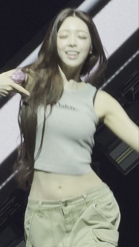 The gray cropped sleeveless top features a form-fitting silhouette that highlights Yuna's healthy charm. The simple design with a logo point adds a trendy touch, and you can achieve a sophisticated luxury mood through minimalist designs like Acne Studios or Maison Margiela.