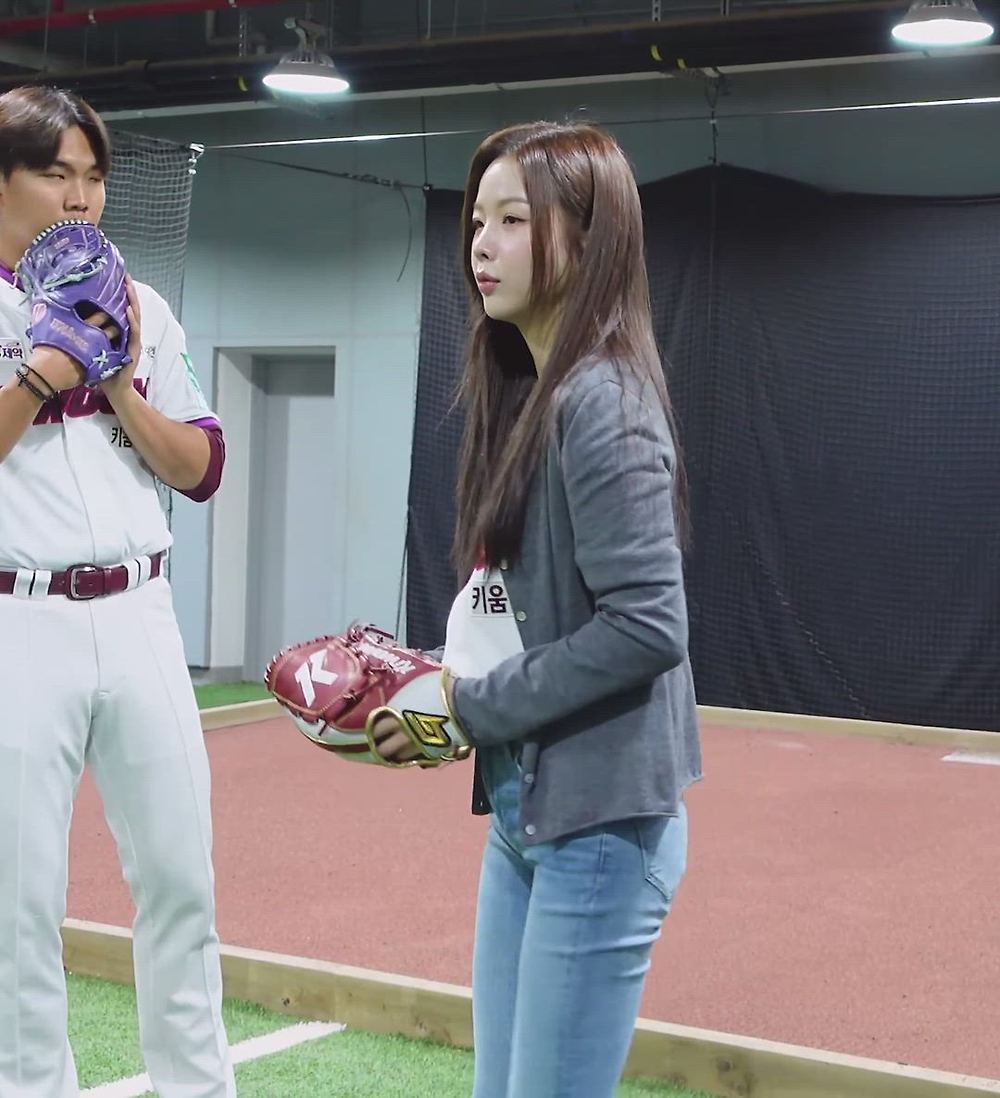 야구장이라는 장소에 맞춰 활동성을 고려한 깔끔한 글러브를 착용하여 스포티한 느낌을 더합니다. 이러한 기능성 아이템은 Wilson이나 Rawlings와 같은 스포츠 전문 브랜드의 제품과 유사한 형태입니다.