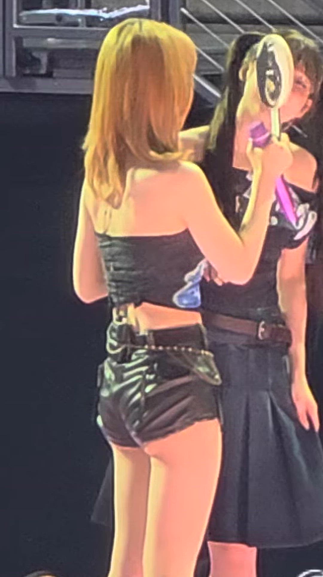 Momo wears a high-end premium stage outfit that radiates intense charisma on stage. The combination of a black-based tube top and short pants highlights Momo's toned physique, completing a sophisticated high-end styling.