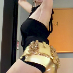 Natty는 화려한 무대 의상을 통해 강렬하고 압도적인 고단가 럭셔리 스타일을 완성합니다. 블랙과 골드의 대비가 돋보이는 이 코디는 무대 위에서의 존재감을 극대화하며 고수익을 창출하는 퍼포먼스 패션의 정수를 보여줍니다.