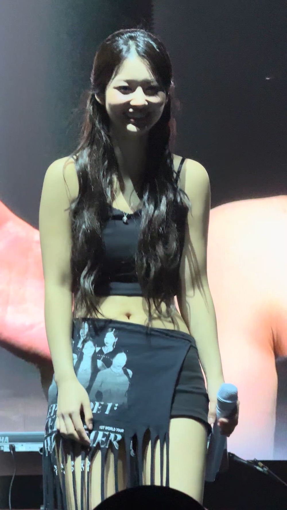 Sullyoon completes a bold and sophisticated stage outfit by matching a black crop top with a skirt featuring graphic details. Through daring exposure and layered styling, Sullyoon demonstrates a trendy sense of style and a premium luxury mood unique to idols.