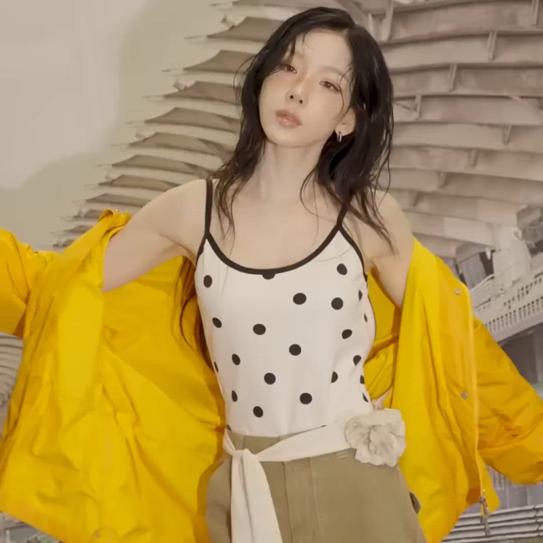 태연은 화이트 바탕에 블랙 도트가 프린트된 슬리브리스 톱을 착용합니다. 그 위에 비비드한 옐로우 셔츠를 걸쳐 레이어드 룩을 완성하며, 이는 Miu Miu나 Jacquemus 스타일의 경쾌한 디자인과 닮아 있습니다.
