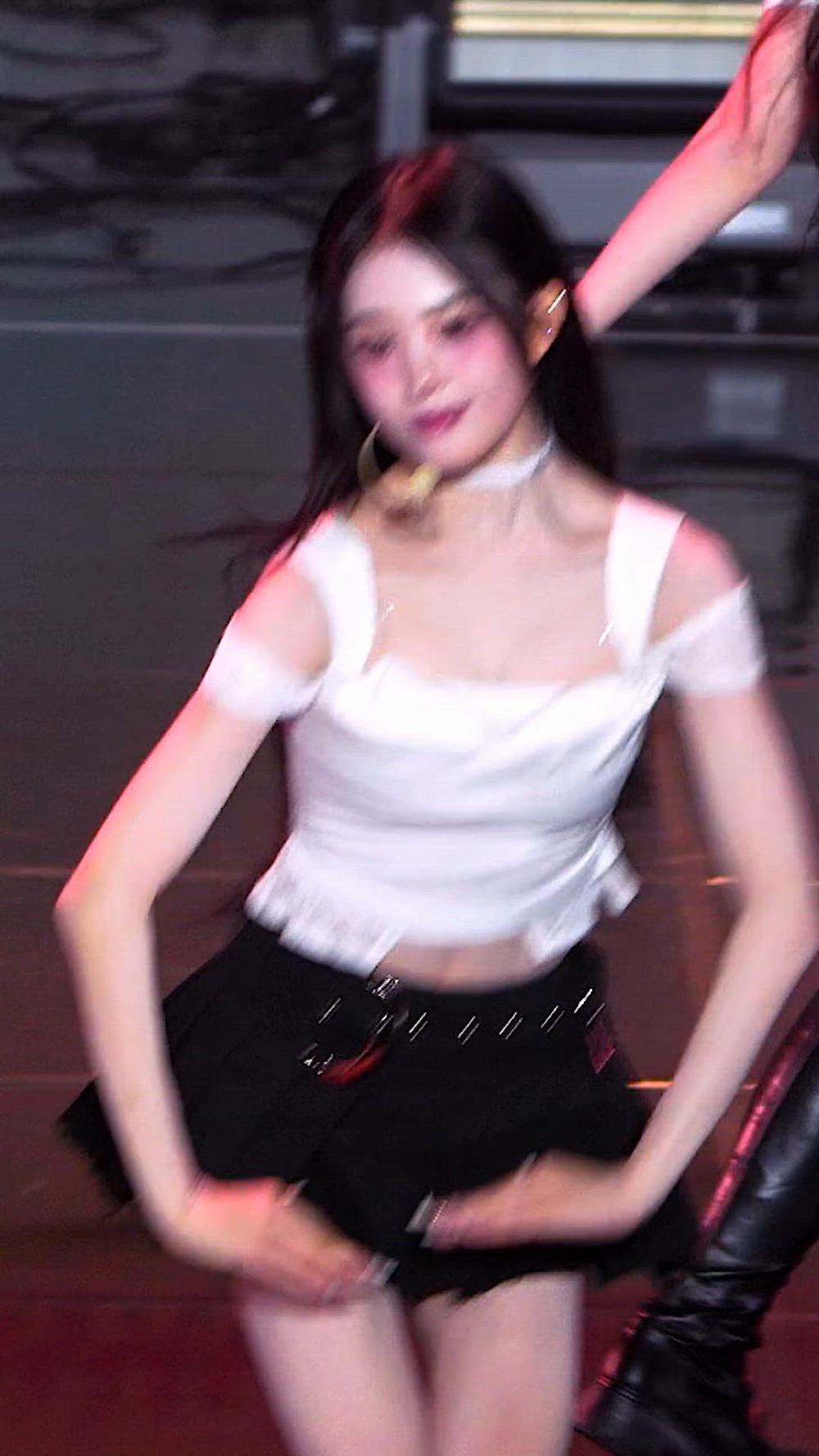 Jiyeon completes a high-teen inspired look by matching a white off-shoulder crop top with a black pleated skirt. This styling is composed of premium items that evoke a trendy luxury mood, making it visually captivating.