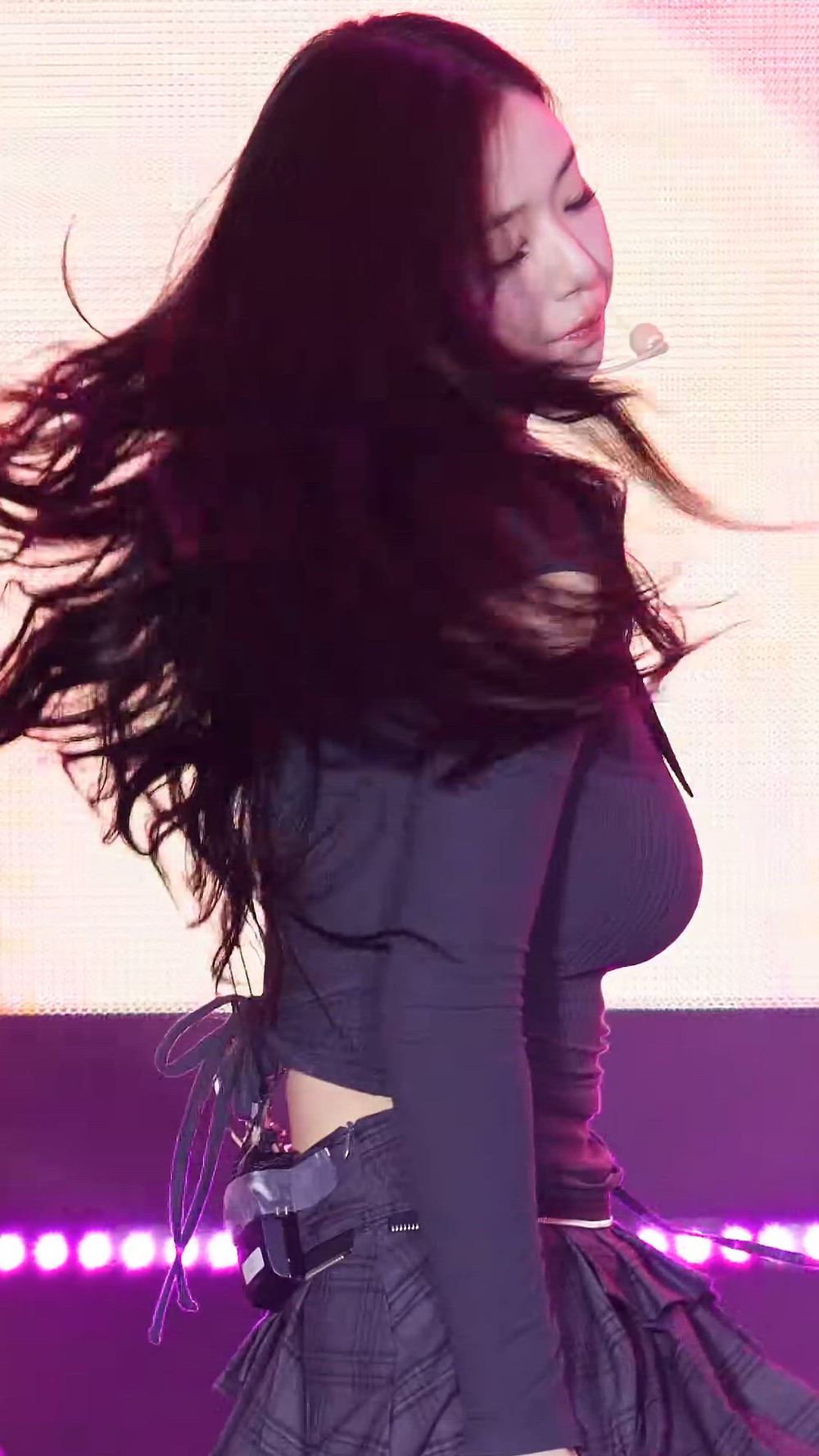 tripleS - Chaeyeon은 세련된 블랙 컬러의 크롭 탑과 플리츠 스커트를 매치하여 현대적인 고단가 럭셔리 스트리트 무드를 완성합니다. 전체적으로 몸의 라인을 강조하는 슬림한 핏을 선택하여 퍼포먼스 중 역동적인 실루엣을 돋보이게 합니다.